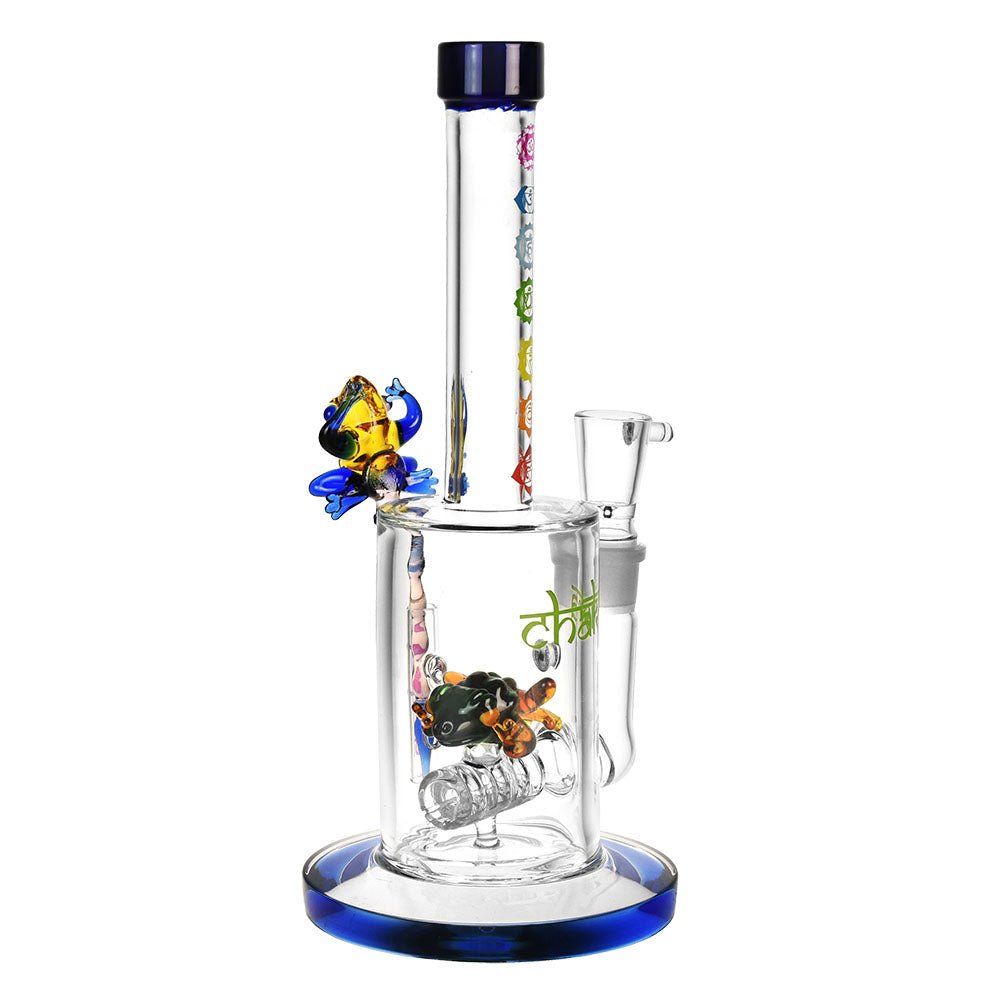 This 9-inch (22.86cm) tall water pipe is crafted from durable borosilicate glass and features a straight body pipe design, ensuring a smooth and enjoyable smoking experience. The inline style percolator not only enhances filtration but also showcases an adorable frog decoration for added charm. With various chakra designs available, each session becomes a visually captivating experience. The inclusion of a 14mm male herb slide adds convenience and versatility to your smoking ritual. Please note that colors may vary.
