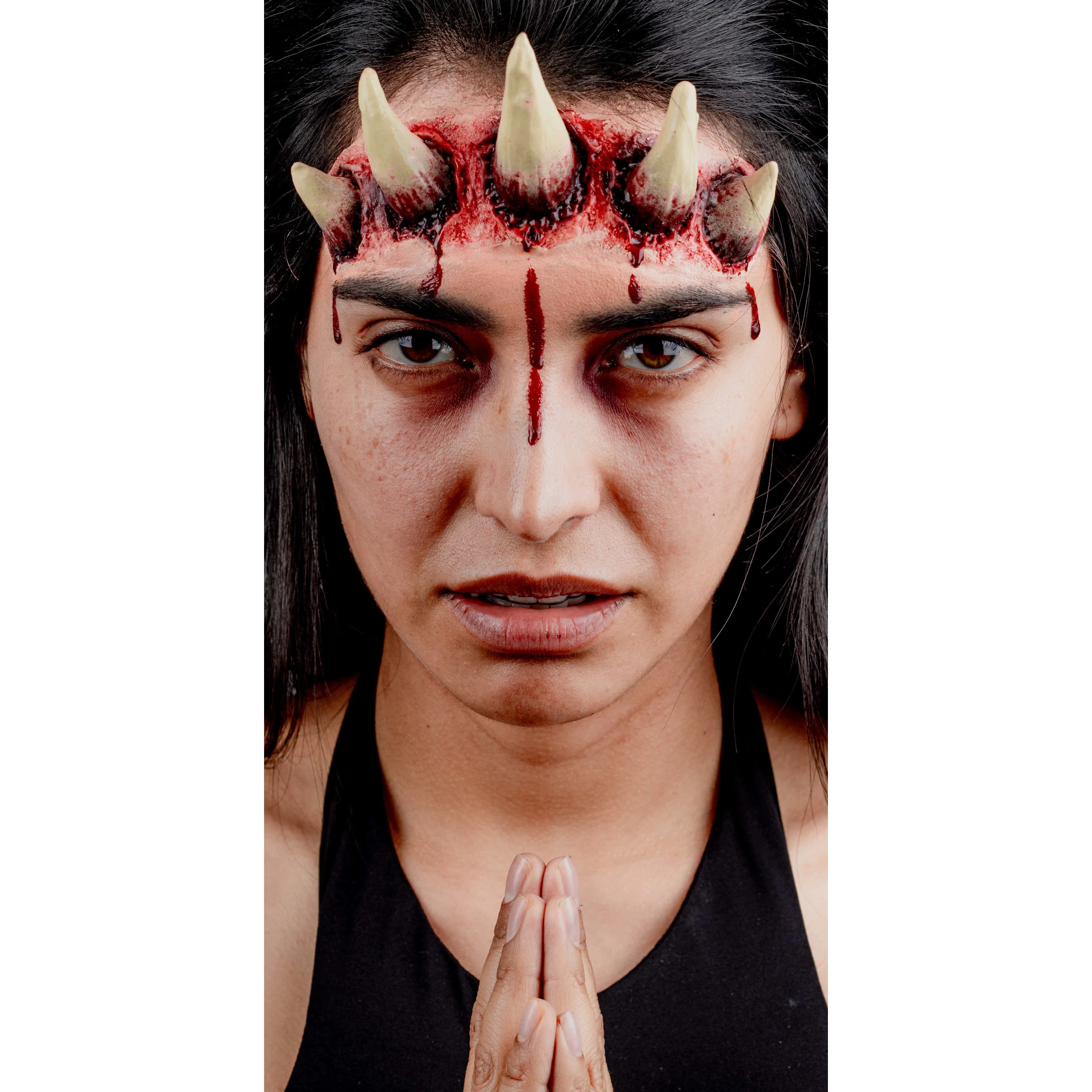Damned Queen latex appliance from the Appliance FX. Transform your face into that of a dark and powerful queen, with horns emerging from your forehead, revealing a creature from another world. This latex application, with its demonic design, gives you a majestic and terrifying appearance, as if you were a damned monarch from the underworld. Perfect for Halloween or horror events, your presence will be as imposing as it is cursed, dominating the darkness with a gaze that unleashes fear. Let your reign of terror be unforgettable! Handmade and painted in Mexico with a completely artisanal process. High Quality, Durability and Original Design by Ghoulish Productions.,Damned Queen latex appliance from the Appliance FX. Transform your face into that of a dark and powerful queen, with horns emerging from your forehead, revealing a creature from another world. This latex application, with its demonic design, gives you a majestic and terrifying appearance, as if you were a damned monarch from the underworld. Perfect for Halloween or horror events, your presence will be as imposing as it is cursed, dominating the darkness with a gaze that unleashes fear. Let your reign of terror be unforgettable! Handmade and painted in Mexico with a completely artisanal process. High Quality, Durability and Original Design by Ghoulish Productions.Handmade and hand painted in Mexico with a totally handmade process. High Quality, Durability and Original Design by Ghoulish Productions.
