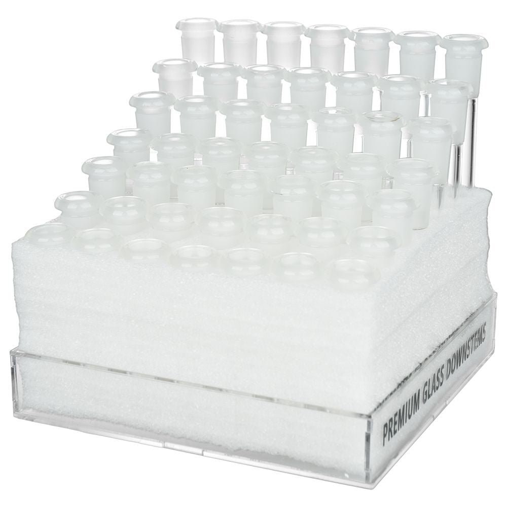 Enhance your smoking experience with precision-crafted glass downstem and a stylish acrylic display stand. This product boasts a 14mm female joint size and comes in a wholesale package of 49 pieces, making it perfect for retailers. The durable glass material ensures long-lasting use, while the unique design provides smooth, clean hits every time. Upgrade your smoke game with our top-of-the-line downstem and display set.