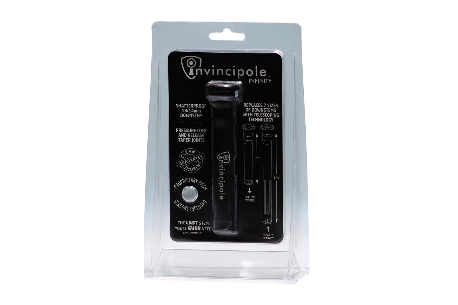 Invincipole features the world’s first Telescoping Technology extending from 3 – 6 inches, fitting a wide range of commonly distributed bongs. The Infinity series features the new pressure lock and release taper joints. The pressure responsive design secures your downstem into the bong then easily releases with a simple click anti-jamming operation, preventing the downstem from wedging in the bong. Meanwhile, internal joints provide superior holding strength plus easy bowl removal with a fluid twist and pull motion.